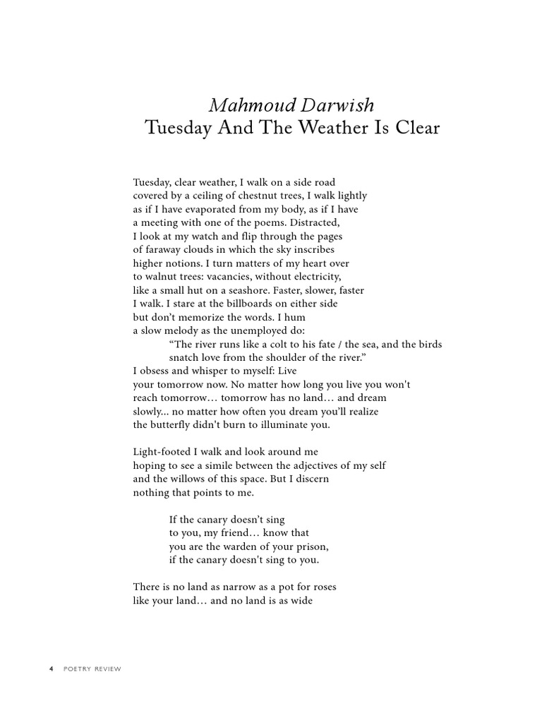 Mahmoud Darwish Tuesday And The Weather Is Clear